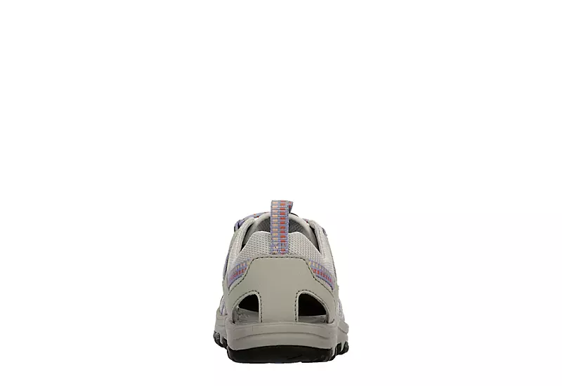 The Manatee girls’ outdoor sandal by Teva is a summer must-have. With a breathable mesh and durable synthetic upper featuring bungee cord lacing for a secure fit, this closed-toe sandal is perfect on the trail or off. The EVA foam midsole cushions every step, while the rubber outsole provides outstanding traction.Â